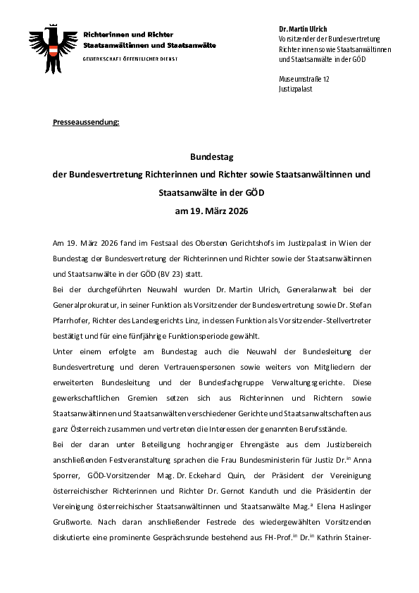 Bundestag der Bundesvertretung Richterinnen und Richter sowie Staatsanwältinnen und Staatsanwälte in der GÖD am 19. März 2026